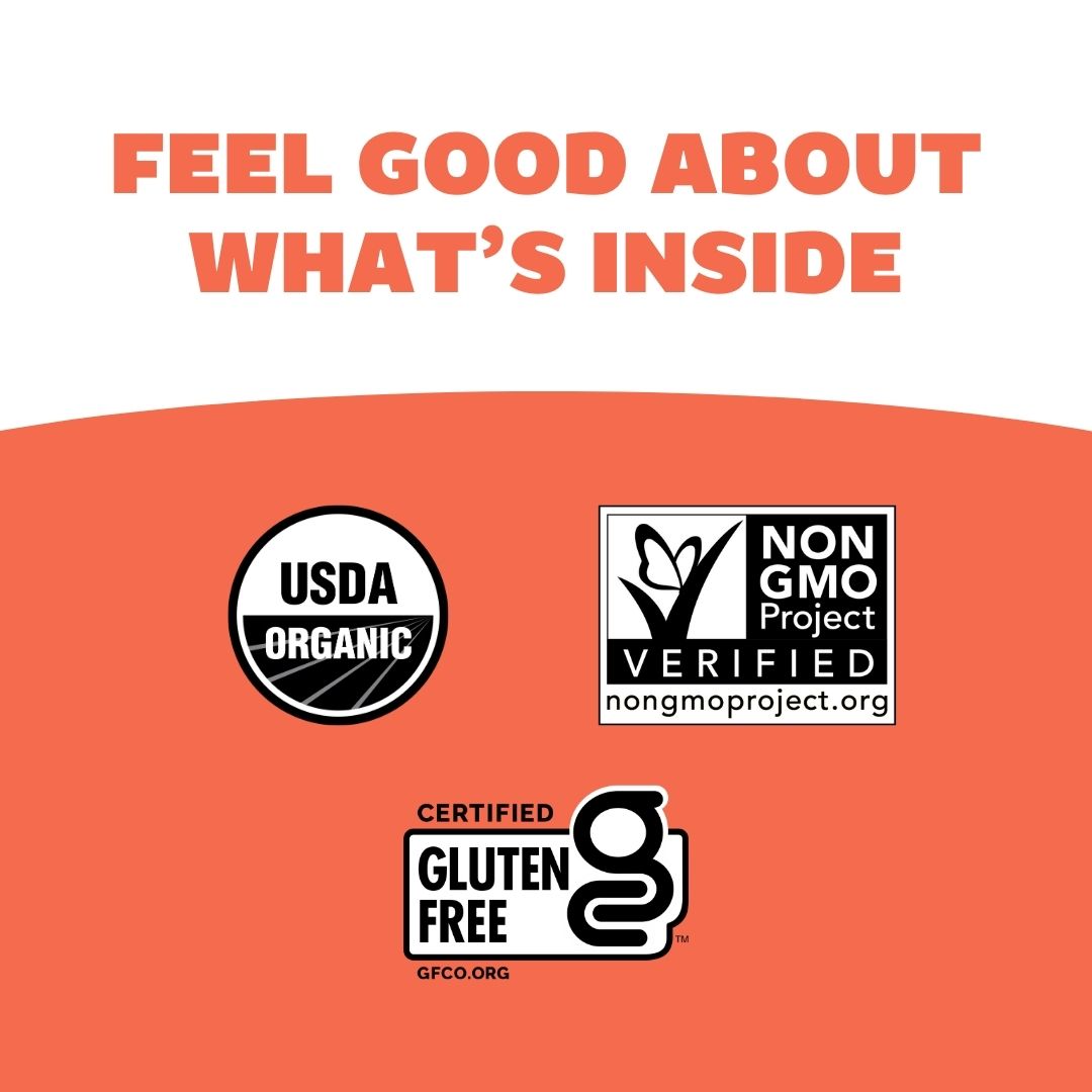 Certification logos for USDA Organic, Non-GMO Project Verified, and Gluten Free on an orange background with text 'Feel Good About What's Inside'.