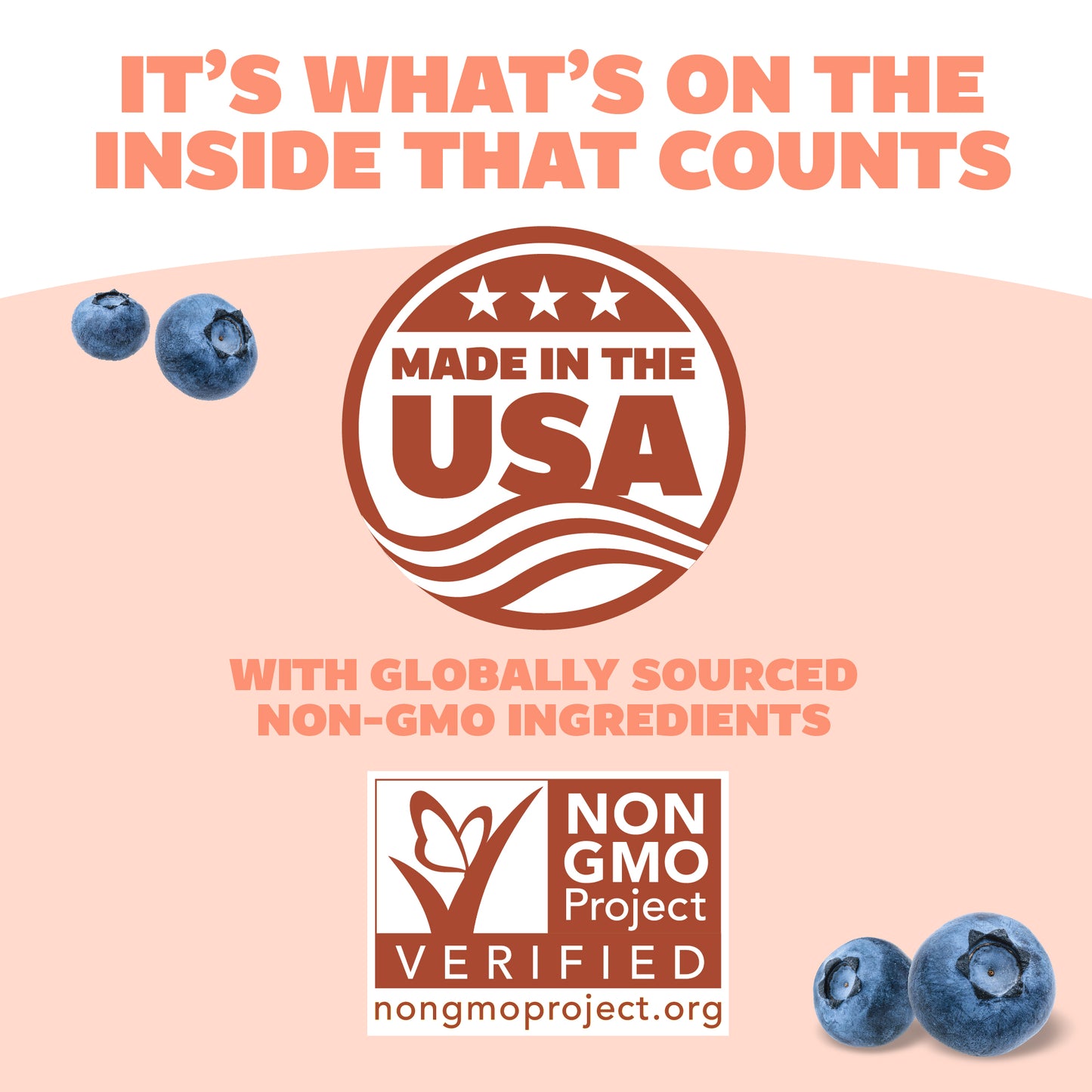 Product label with 'Made in the USA' and 'Non GMO Project Verified' logos on a light pink background with blueberries.
