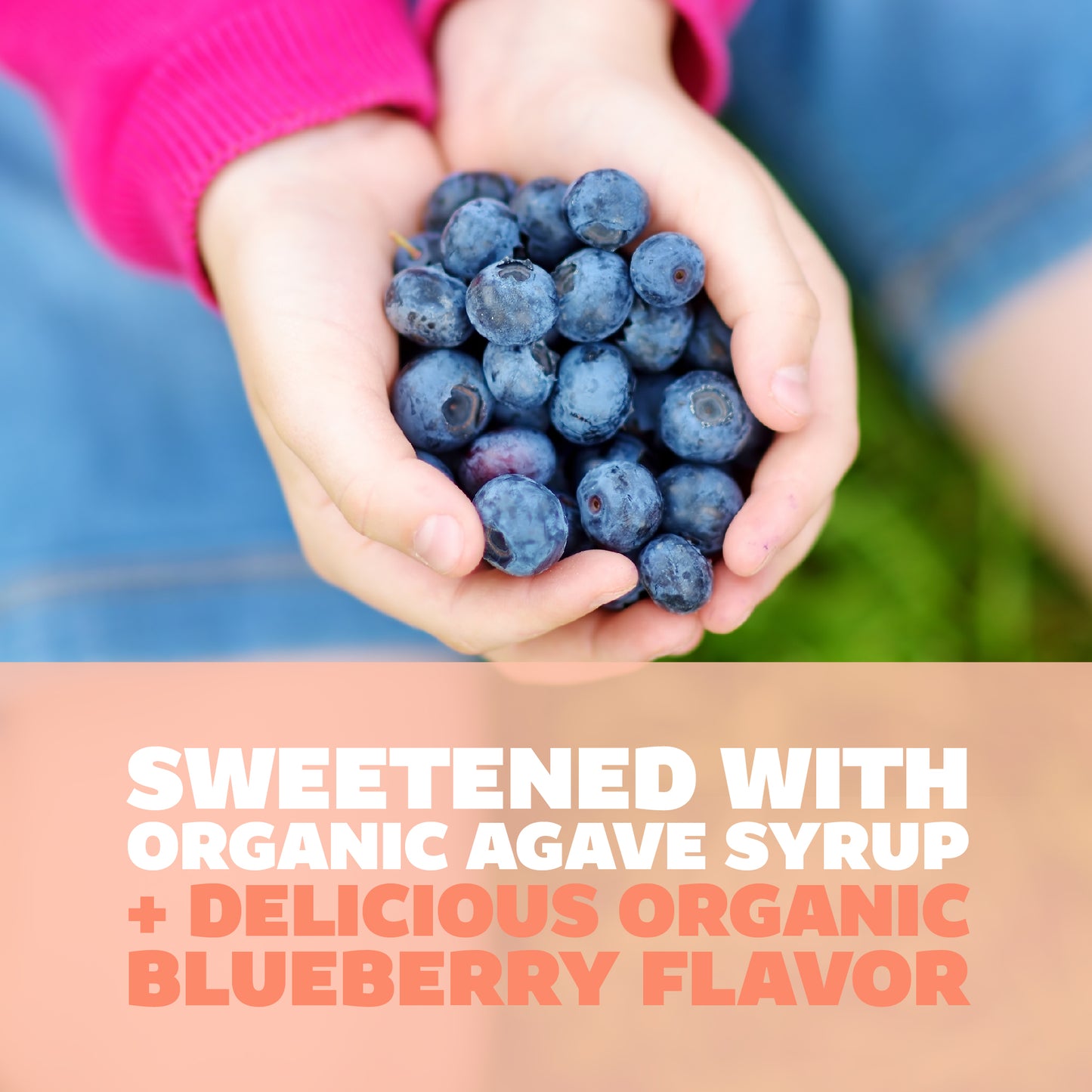 Hands holding blueberries with text about organic agave syrup and blueberry flavor.