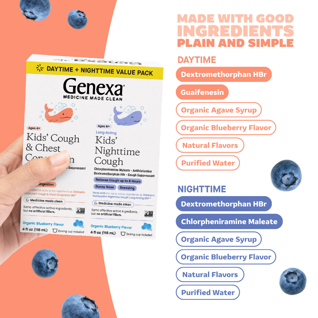 Genexa kids' cough and congestion medicine bottles with packaging on a white background