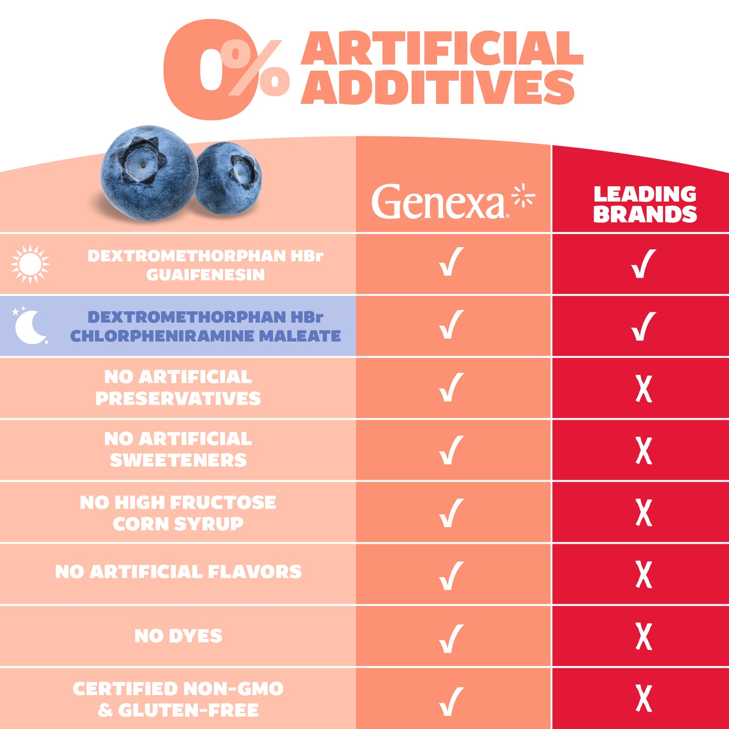 Genexa cough medicine bottle with red and orange background, highlighting artificial additives.