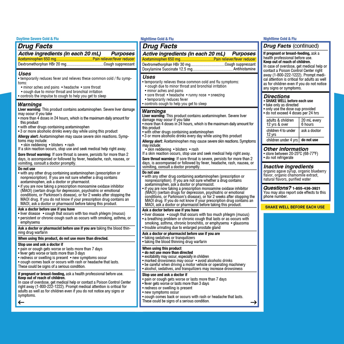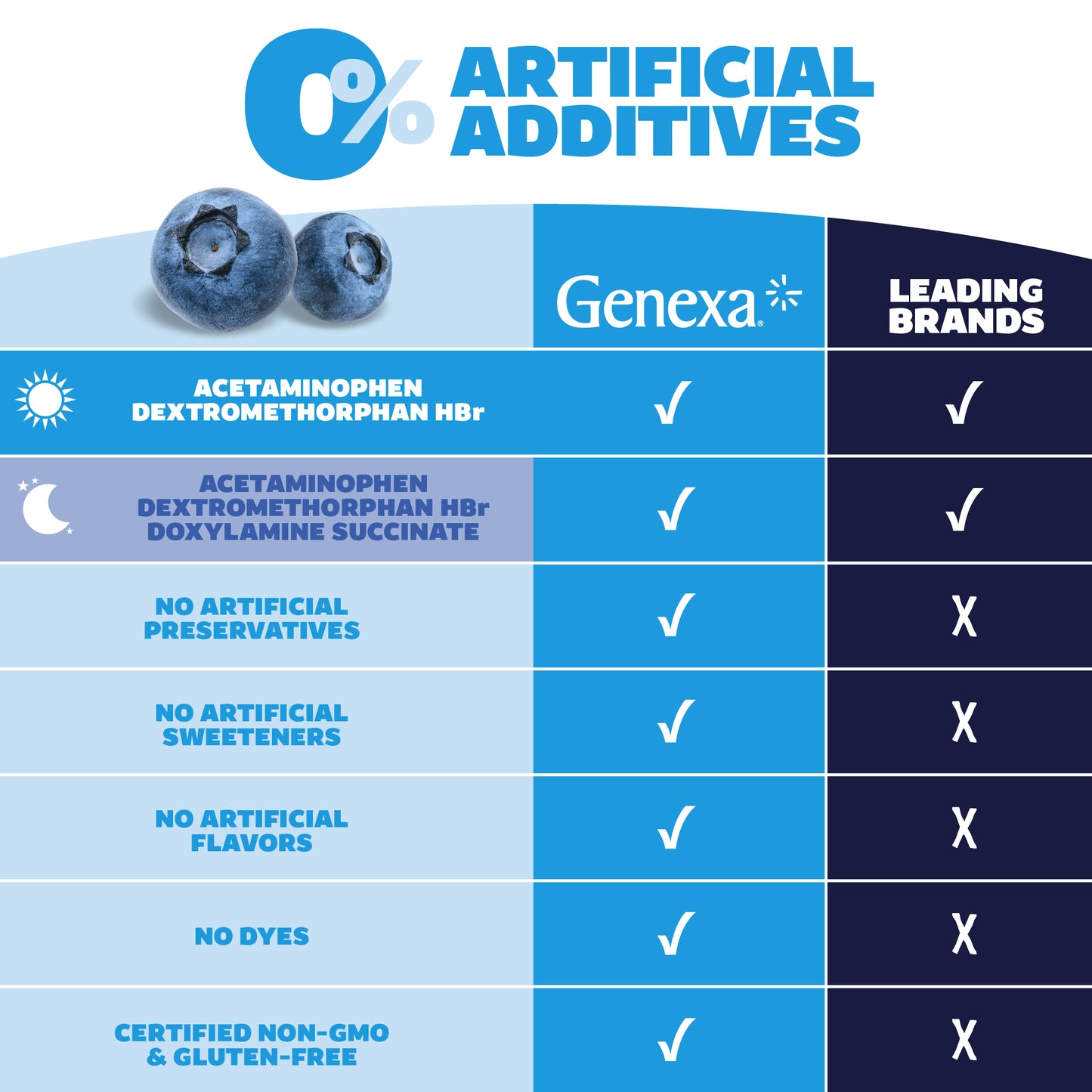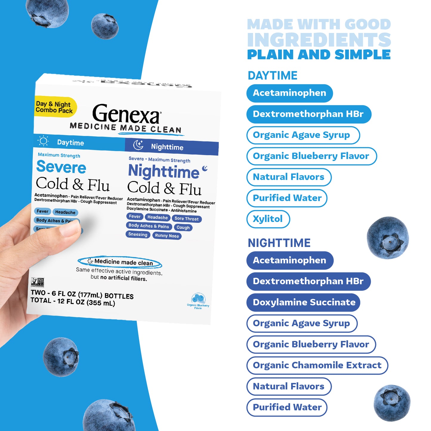 Genexa Severe Cold & Flu Daytime + Nighttime is a day and night value pack containing two medicines made with effective active ingredients you need for day to night cold and flu symptom relief, but without artificial dyes, sweeteners, and preservatives, and no parabens or common allergens.