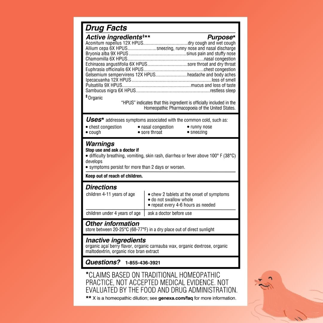 Genexa Kids' Cold Crush is a real remedy, made clean. This homeopathic remedy addresses symptoms of the common cold including congestion, mucus, cough, sore throat, runny nose, and sneezing*.