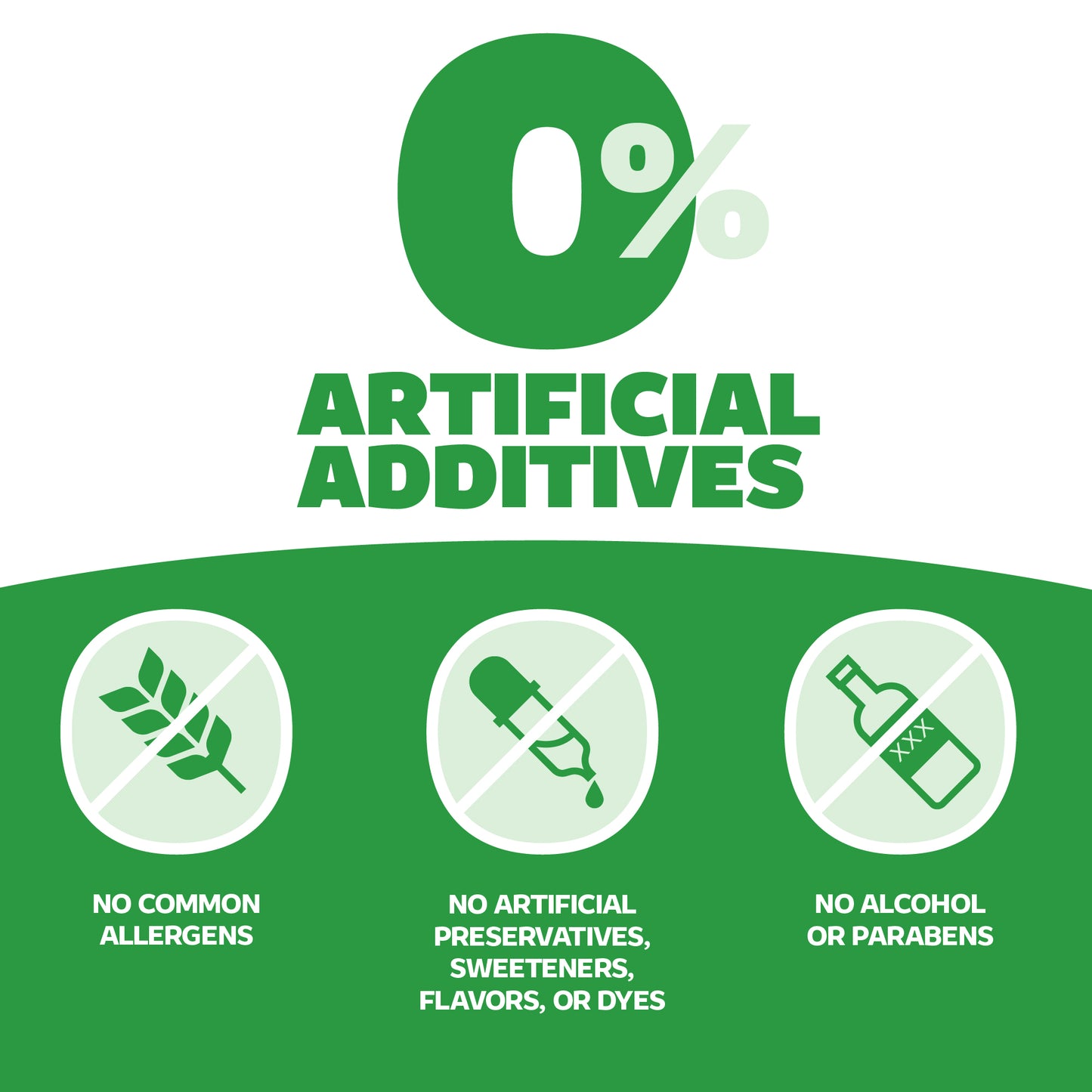 Green banner with '0% Artificial Additives' text and icons indicating no common allergens, artificial preservatives, sweeteners, flavors, or dyes.