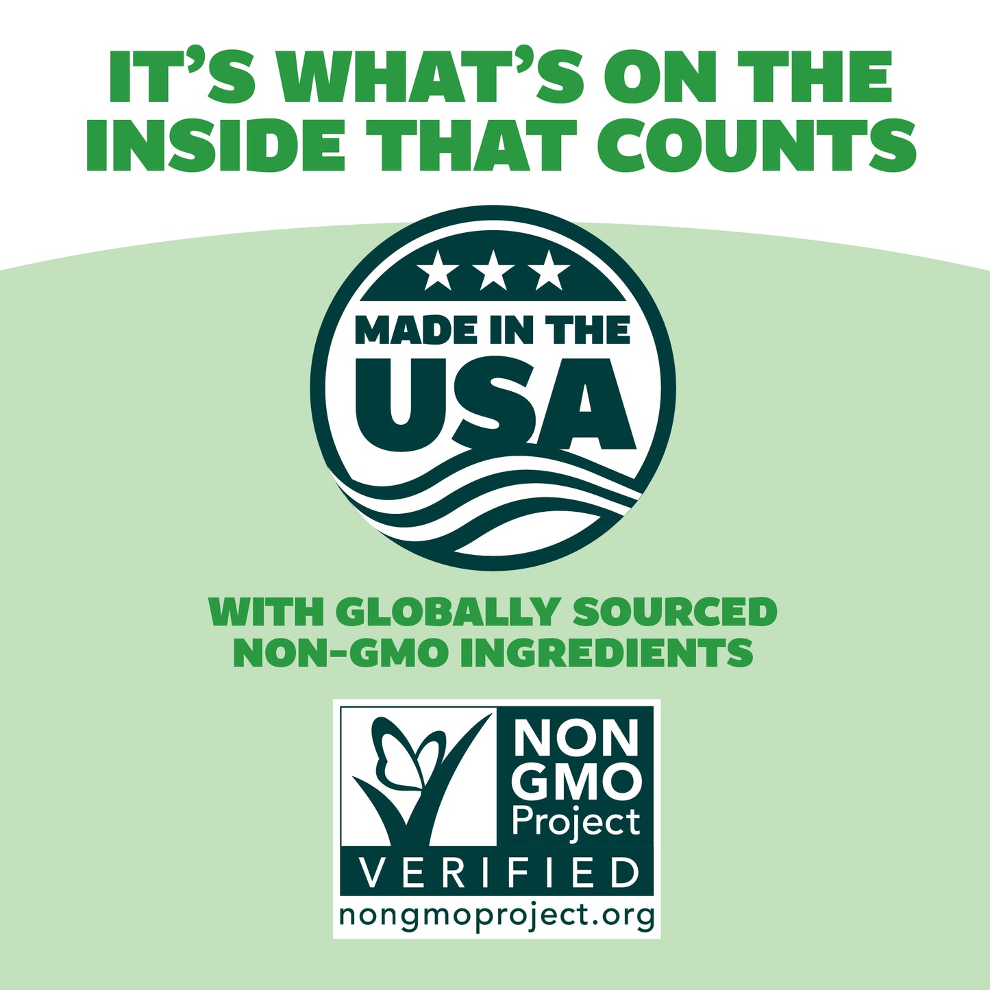 Certification label for 'Made in the USA' with globally sourced non-GMO ingredients, featuring the Non GMO Project Verified logo.