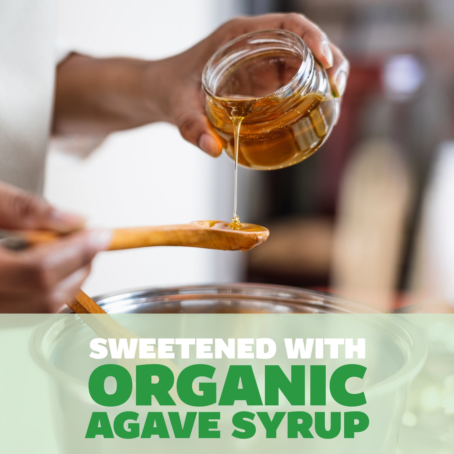 Person pouring organic agave syrup from a jar onto a wooden spoon with text 'Sweetened with Organic Agave Syrup' below.