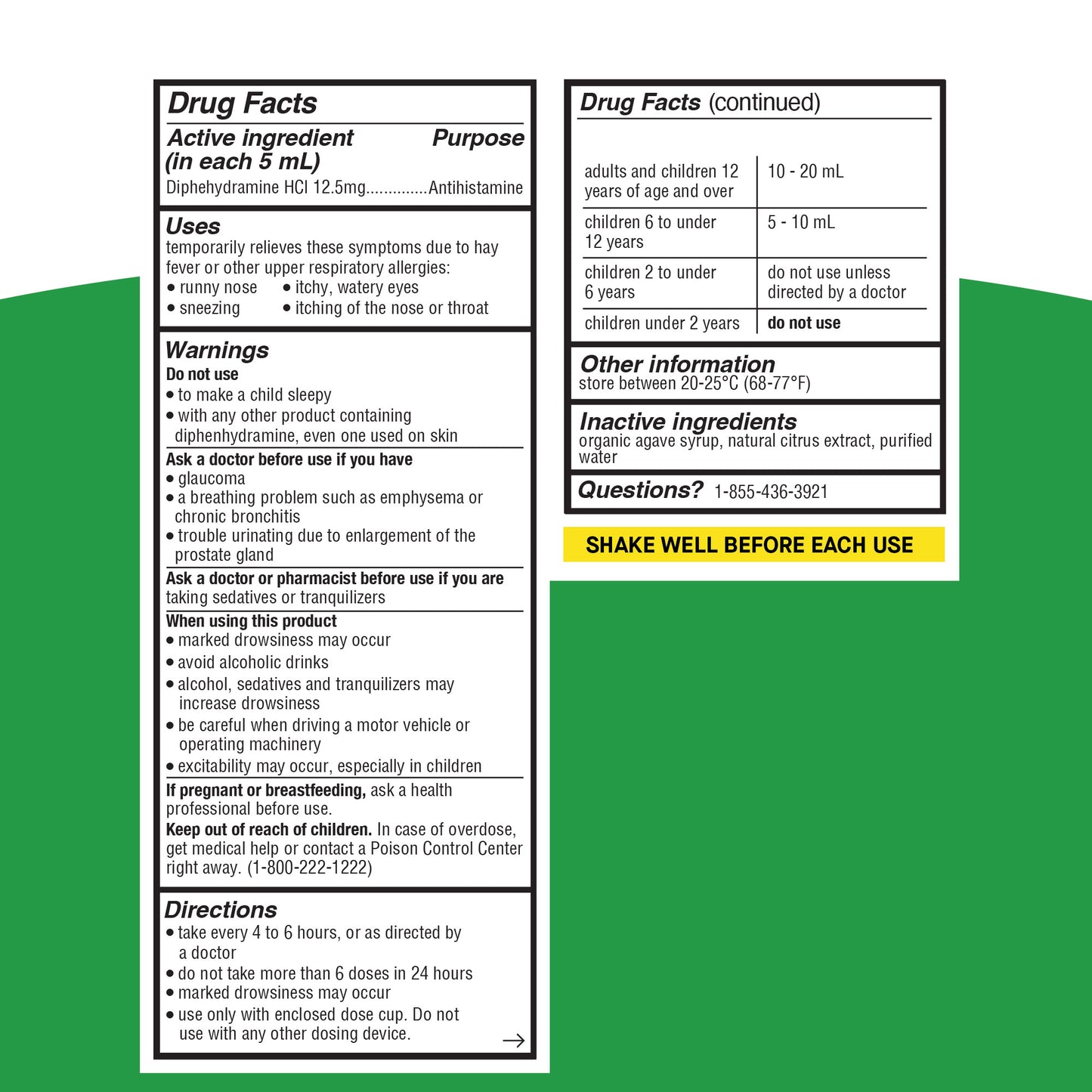 Drug facts label for a medication on a green background