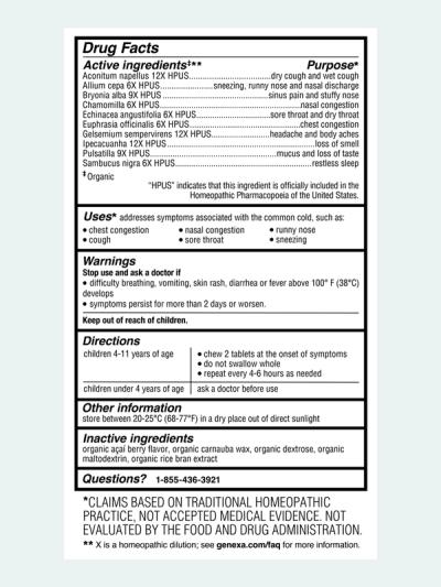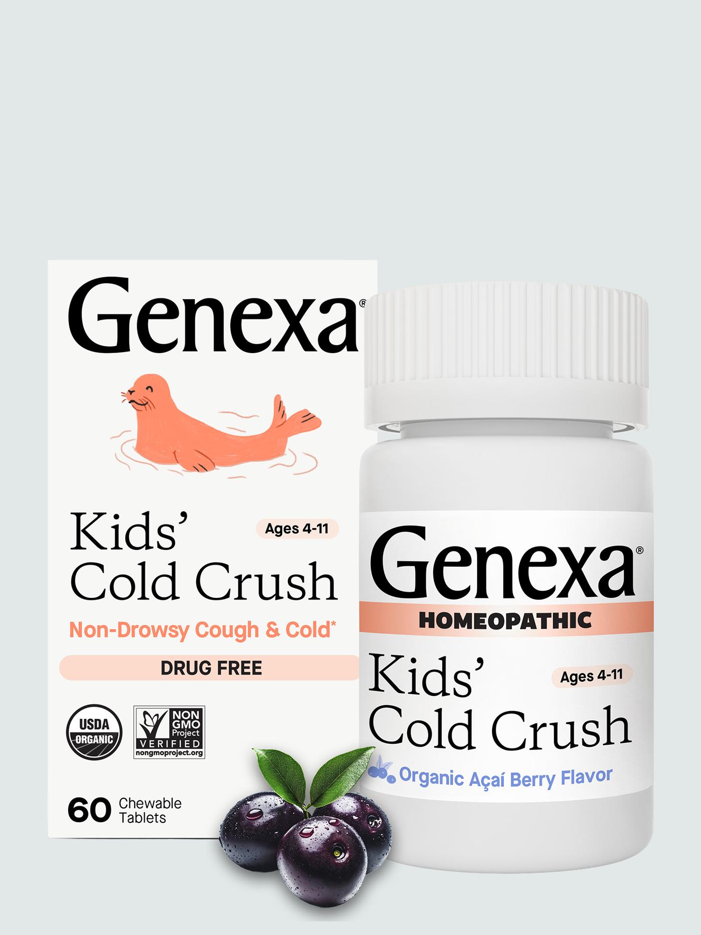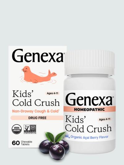 Genexa Kids' Cold Crush is a real remedy, made clean. This homeopathic remedy addresses symptoms of the common cold including congestion, mucus, cough, sore throat, runny nose, and sneezing*.